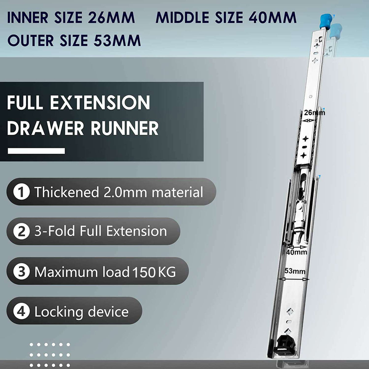 32"/812mm length. 3-Fold Full Extension, opening allows for the entire drawer to be accessed.make full use of drawer space.Solid ball bearing design.provides slient and friction-free motions when open drawer.
