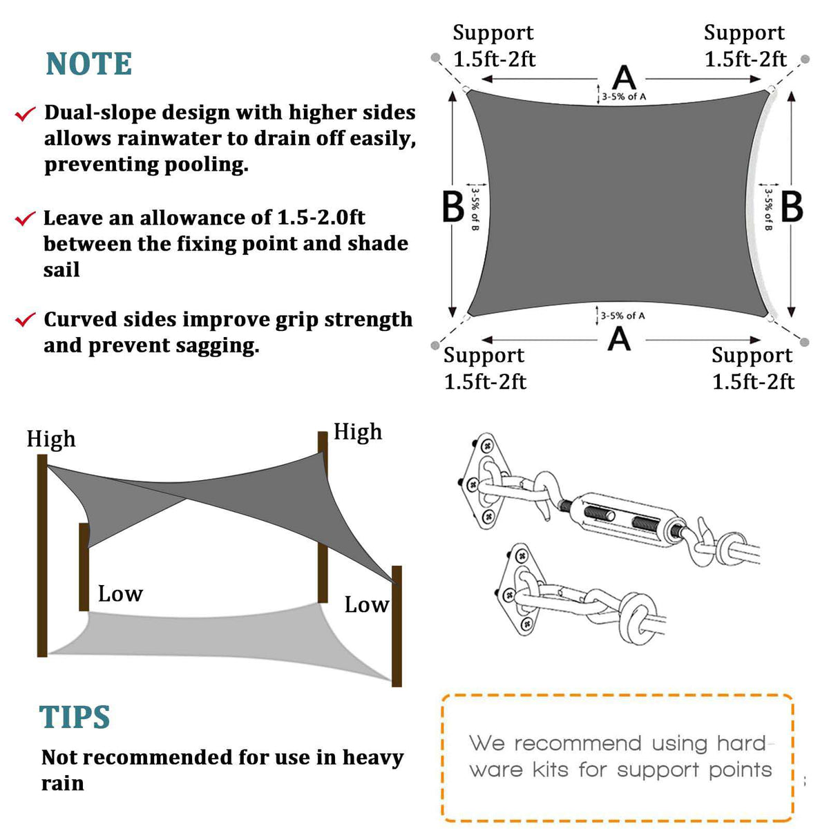 3m x 5m Grey Rectangle Sun Shade Sails for Patios Sun UV Outdoor Canopy Backyard Sunshades (Online Order Only)