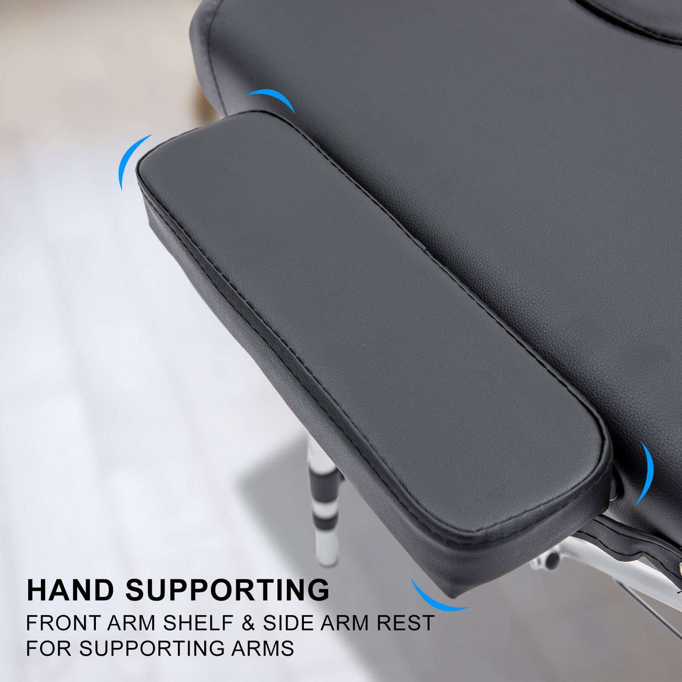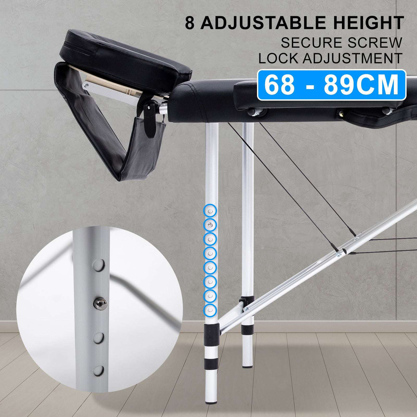 With an aluminium-made structure, it ensures that the table is light-weighted, allowing users to carry it to different places. However, this doesn't sacrifice its safety as it is equipped and reinforced with a w-shaped pole that goes across both legs. It helps increase the stability of the table, preventing it from toppling over. Furthermore, this latest design is harnessed with a Quick-Lock system, reducing hassles in opening and folding up the table. The legs are also equipped with 8 adjustable heights, to suit masseuses and beauty therapists of different heights, making sure they are working comfortably and providing their best service.