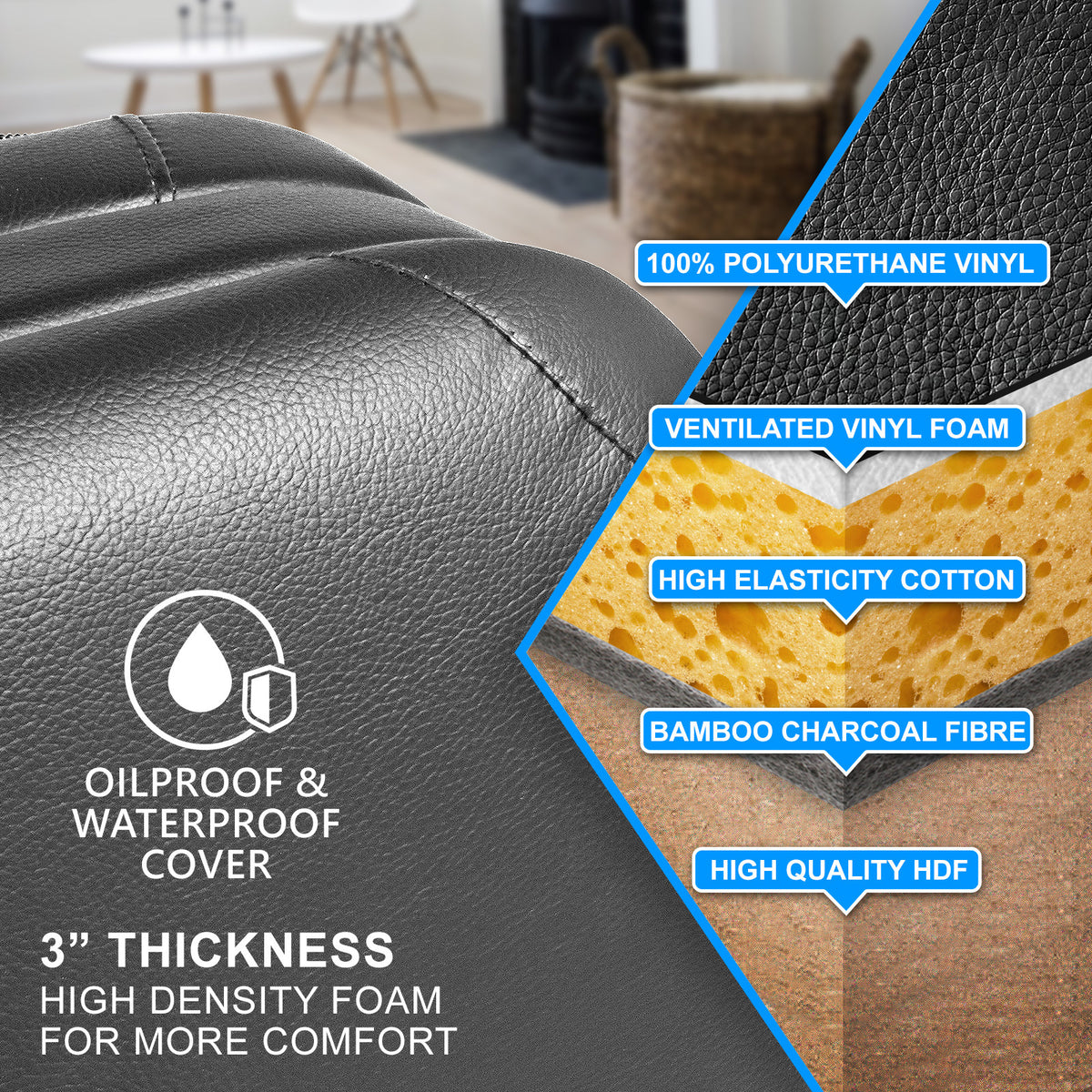 - Upholstered with high-quality PVC leather ensuring oil and waterproof and easy to clean