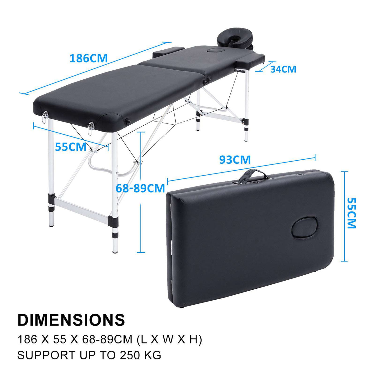 The high-quality massage table 55cm wide 2-fold aluminium comes with a disposable sheet cover set and a black carry bag. This is not only a mere great bargain, but also a portable product with all means of functional components.