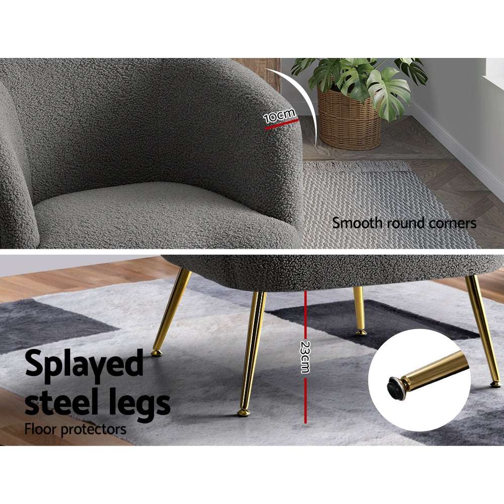 Snuggle up and fall in love with our most eye-catching Artiss Carneiro Armchair. Not an ordinary one but stands out in every aspect, whether it''s craftsmanship, style, upholstery, comfort, or quality that speaks for itself. It is something you would surely want to add to your space. It's perfect for your relaxation zone after a long, tiring day. Artiss Carneiro armchair offers a wide and welcoming seat for you to relax and is ideal for every corner of your space where you want to add soft and comfy touches. Crafted with great attention to details, this armchair feature luxurious upholstery with high-resilience foam and solid structure. It is quite sturdy and will withstand the test of time. Our Carneiro armchair is upholstered in soft sherpa fabric that epitomises luxury with its smooth appearance and adds a cosy and relaxing feel to your space. Its curvy winged backrest creates an enveloping feel that makes you feel snuggled. Plus, the golden splayed steel legs with floor protectors will offer optimum stability and protection to your floors and add a luxurious charm to your space with its gorgeous presence. Our Carneiro armchair is super comfortable to relax on and possess stylish, elegant, and contemporary good looks, making it a must-have piece of furniture for your home.
