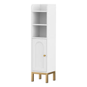 Elevate your bathroom organization with this ultra-slim storage cabinet, expertly crafted to maximize space in narrow Australian homes. Measuring just 20x20x84cm, its space-saving profile tucks seamlessly beside toilets or vanities while the elegant arched door and gold-toned legs add boutique charm. Enjoy versatile 3-tier storage: display potted plants on the open top shelf, adjust the middle compartment for toiletries of any height, and conceal spare toilet rolls in the enclosed bottom cabinet. Built from MDF with reinforced metal legs and an included anti-tip safety kit. Effortless tool-free assembly makes this durable, family-friendly organizer perfect for rentals or compact spaces—transforming clutter into curated style with uncompromising functionality.
