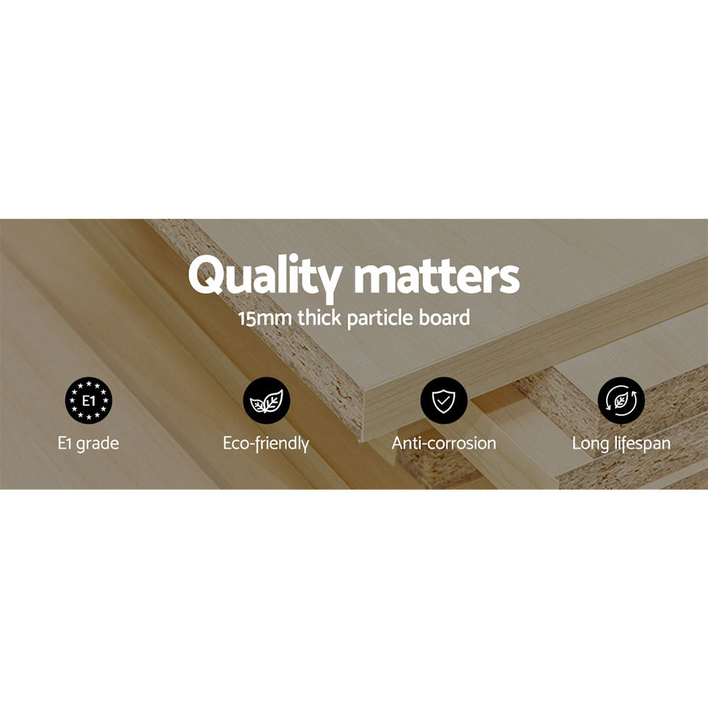 Want to add a WOW-effect to your living room? Our Artiss LED entertainment unit won't disappoint you. Boasting a unique combination of functionality and creativity, this entertainment unit is designed to enhance your living space and create a pleasant ambience. The entertainment unit features built-in RGB LED lighting that you can customise into 16 different colours and four flashing modes with a touch of a button. It will perfectly complement your modern home decor and enable you to achieve a one-of-a-kind look. Having been constructed from 15mm thick particle board with melamine finish, this piece of furniture is quite sturdy and will withstand the test of time. It has spacious drawers with smooth metal runners for hassle-free operation and two tempered glass shelves to store all your entertainment paraphernalia. Bring this uniquely designed entertainment unit for your home today.