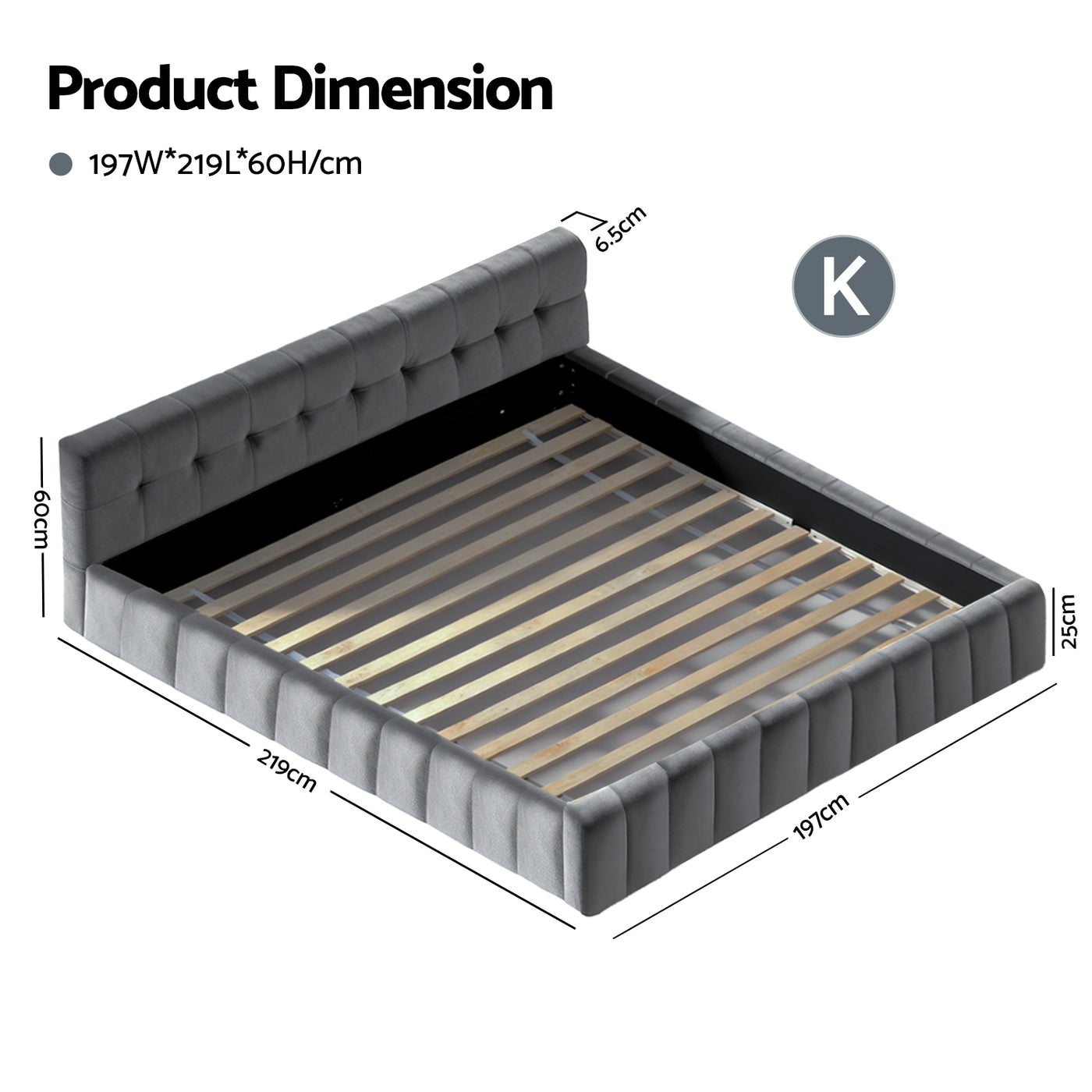 The Artiss King Bed Frame combines elegance and function with its cloud-inspired plush velvet headboard and modern platform base. Featuring a reinforced plywood-pine frame with 14 support slats and durable metal fixings, it holds 300kg and fits king mattresses (183x203cm). The smooth-edge velvet upholstery adds luxury while ensuring safety. Quick assembly completes this bedroom upgrade.