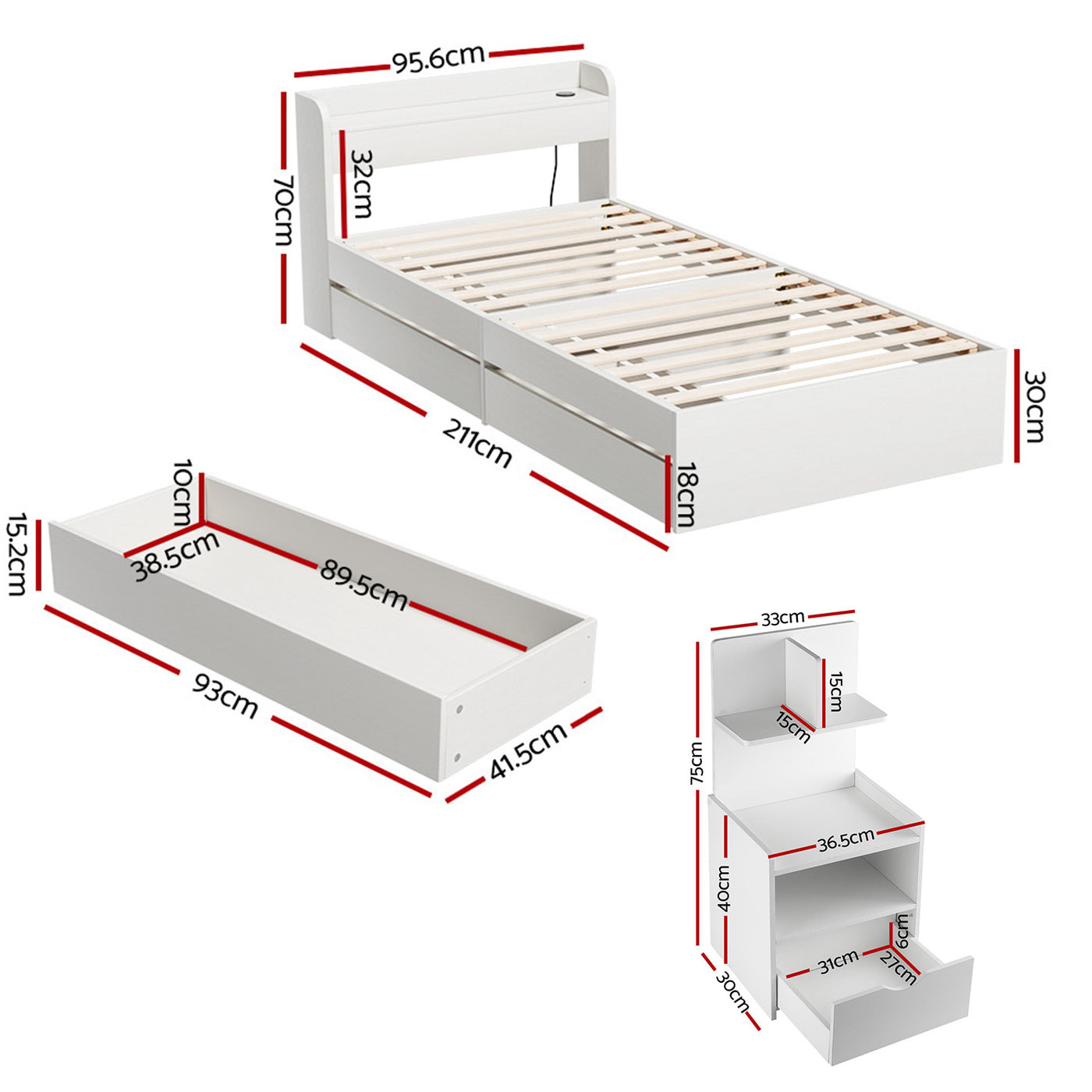 Artiss Aura Bed Frame: Experience restful nights like never before with the Aura Bed Frame, crafted from high-quality 15mm and 18mm particleboard, complemented by 12mm plywood slats for optimal support. The sturdy construction ensures noise-free use, prolonging the life of your mattress. With a multifunctional design, this bed frame features two convenient storage drawers on smooth castor wheels, easily positioned on either side for your preference. The headboard is designed with smooth edges and ample space for your bedroom essentials, while integrated USB charging ports connected to a 200cm cable make it easy to power your devices overnight.