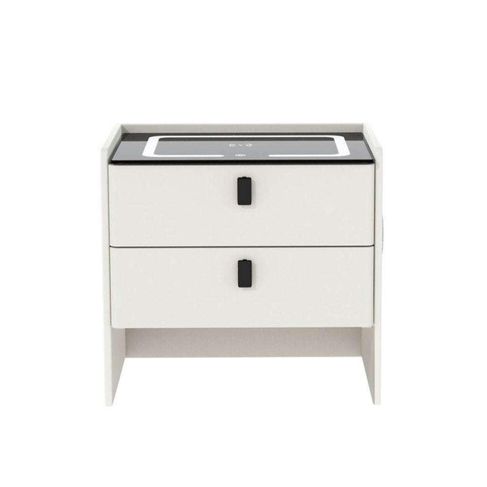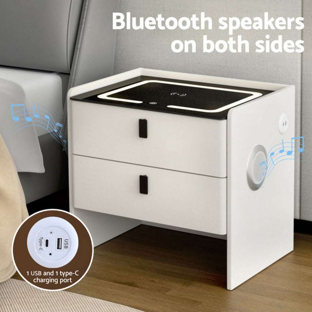 Upgrade your bedroom with the Artiss Smart Bedside Table, offering a perfect combination of technology and sleek design. This table features wireless charging, dual Bluetooth speakers, and both USB and type-C charging ports, all powered by an SAA adaptor. The three adjustable LED light colours allow you to customise your ambience, whether you're reading or relaxing.