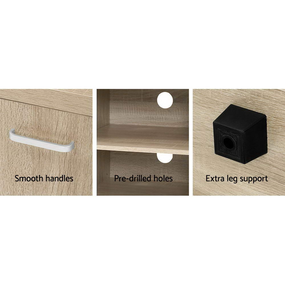 Your treasured home entertainment system deserves the best cabinet for it. And that is why our Artiss Maxi Entertainment Unit is the ideal choice for you. Incorporating a contemporary design and presented with durable and strong 30mm thick honeycomb board and 15mm thick particle board, our entertainment unit displays great craftsmanship with equally fine hardware to ensure trouble-free use every time. The natural woodgrain finish is beautiful and smooth to the touch, making the unit not only good-looking but easy to clean and maintain. And it offers ample storage space with two open shelves and two deep cabinets with magnetic door catches for all your entertainment essentials. Better still, the ensemble features smooth handles for a sleek appearance and pre-drilled holes to keep all your cables tidy. The simple and linear design means that the unit will suit any decoration and be the perfect addition to your modern living room. And best of all, you can also match with other products from the Maxi series for the complete simple-natural look.