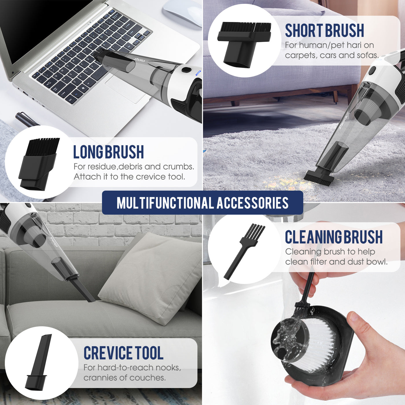 Multifunctional Accessories: Includes a long brush for residue and crumbs, a short brush for carpets and pet hair, and a crevice tool for hard-to-reach nooks and crannies.