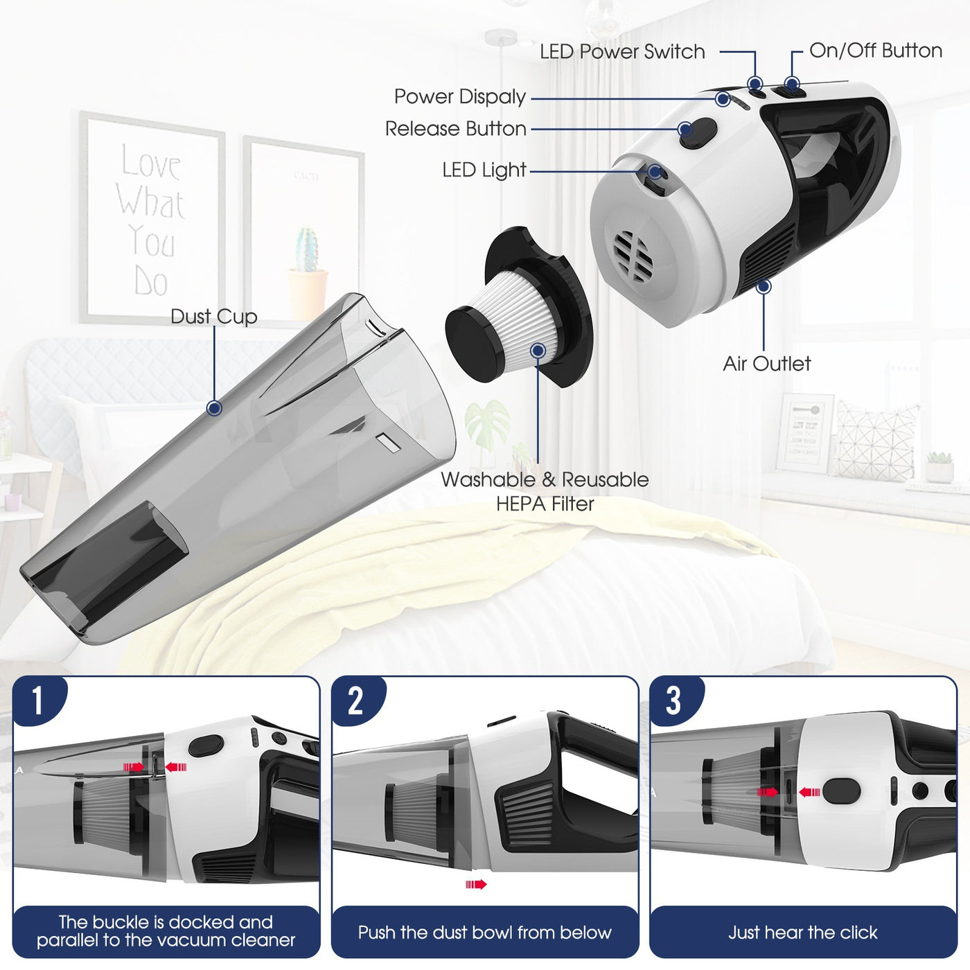 Easy Maintenance: Features a simple power display release button to detach the dust cup for easy emptying. A cleaning brush is also included to help clean the filter.