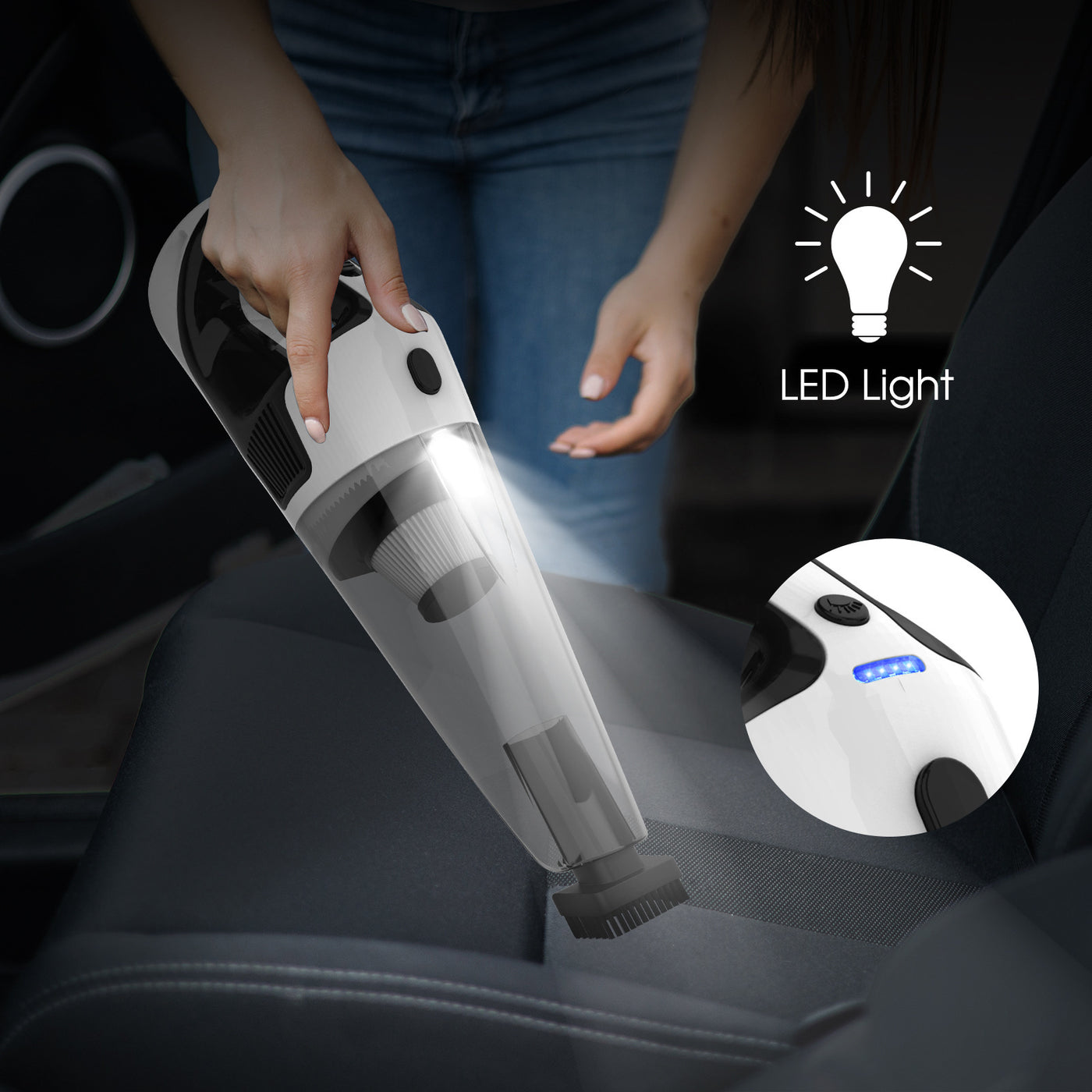 Built-in LED Light: Illuminates dark areas like under car seats or in crevices for a thorough clean.