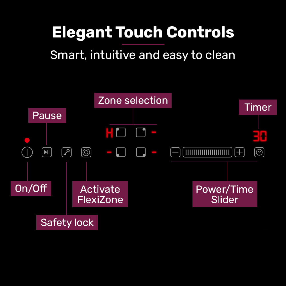 - 4 Cooking zones with 2 FlexiZone extendable hobs