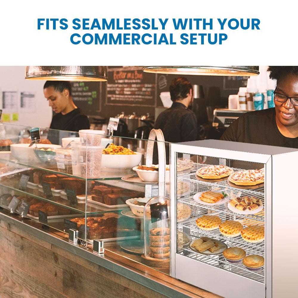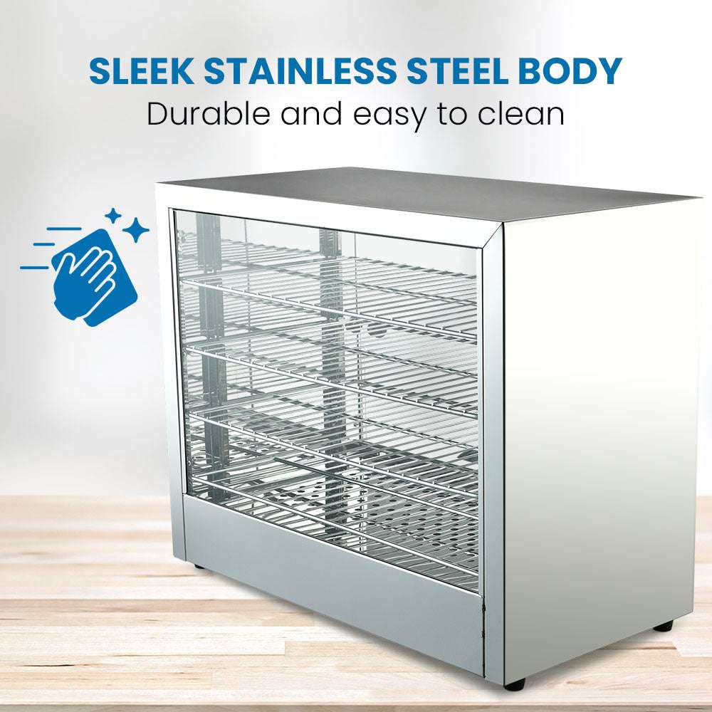 The EuroChef has all the features you need to keep up with demand. Heat resistant handles on the sliding glass doors ensure easy access for staff throughout the day. The four large 57x30cm removal stainless steel shelves are easy to clean and provide plenty of space for all of your food products. This EuroChef Food Warmer Display is the perfect choice for cafes, bakeries, food stands and other food vendors that need to keep food presentable and ready to serve.