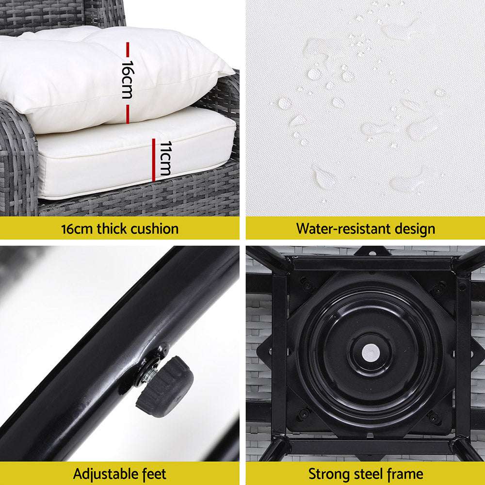 Say goodbye to uncomfortable outdoor furniture and say hello to Gardeon swivel outdoor furniture set. With this furniture set, you can create a relaxed outdoor setting easily that makes a perfect spot for peaceful reading or just unwinding on sunny afternoons with your partner. This outdoor swivel furniture set comprises of two swivel chairs and a side table. Its weather-resistant and UV-resistant design makes it suitable for both indoor and outdoor use. The outdoor swivel furniture set is crafted from durable PE wicker with heavy-duty powder-coated steel frame for ultimate sturdiness. Its meticulously woven PE wicker ensures it lasts long and looks desirable. The two chairs come with 360˚ swivel mechanism, which enables you to face any direction easily, and the soft cushioned seat makes it utterly comfortable to sit for a longer time without experiencing any pain or discomfort. The cushions have removable covers for easy cleaning and washing, and the UV-resistant properties prevents the cushion cover colour from fading. Furthermore, the side table has 5mm thick tempered glass top for durability and strength. Bring home our Gardeon swivel outdoor furniture set for your space today. This versatile swivel furniture set can be styled in multiple ways. So put on your creative hat and start styling.