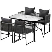 Elevate outdoor living with the Gardeon 5-Piece Outdoor Dining Set��perfect for sunny gatherings! The rust-proof powder-coated steel frame ensures lasting durability, while the all-weather synthetic fabric resists sun, rain, and stains. The set features 190g polyester rope chairs with sturdy steel frames for breathable comfort and stability, paired with a tempered glass table that includes a convenient parasol hole for shade. With floor protectors for added stability and a sleek, versatile design, this low-maintenance set transitions seamlessly from patio to indoor dining��ideal for relaxing meals under the open sky!