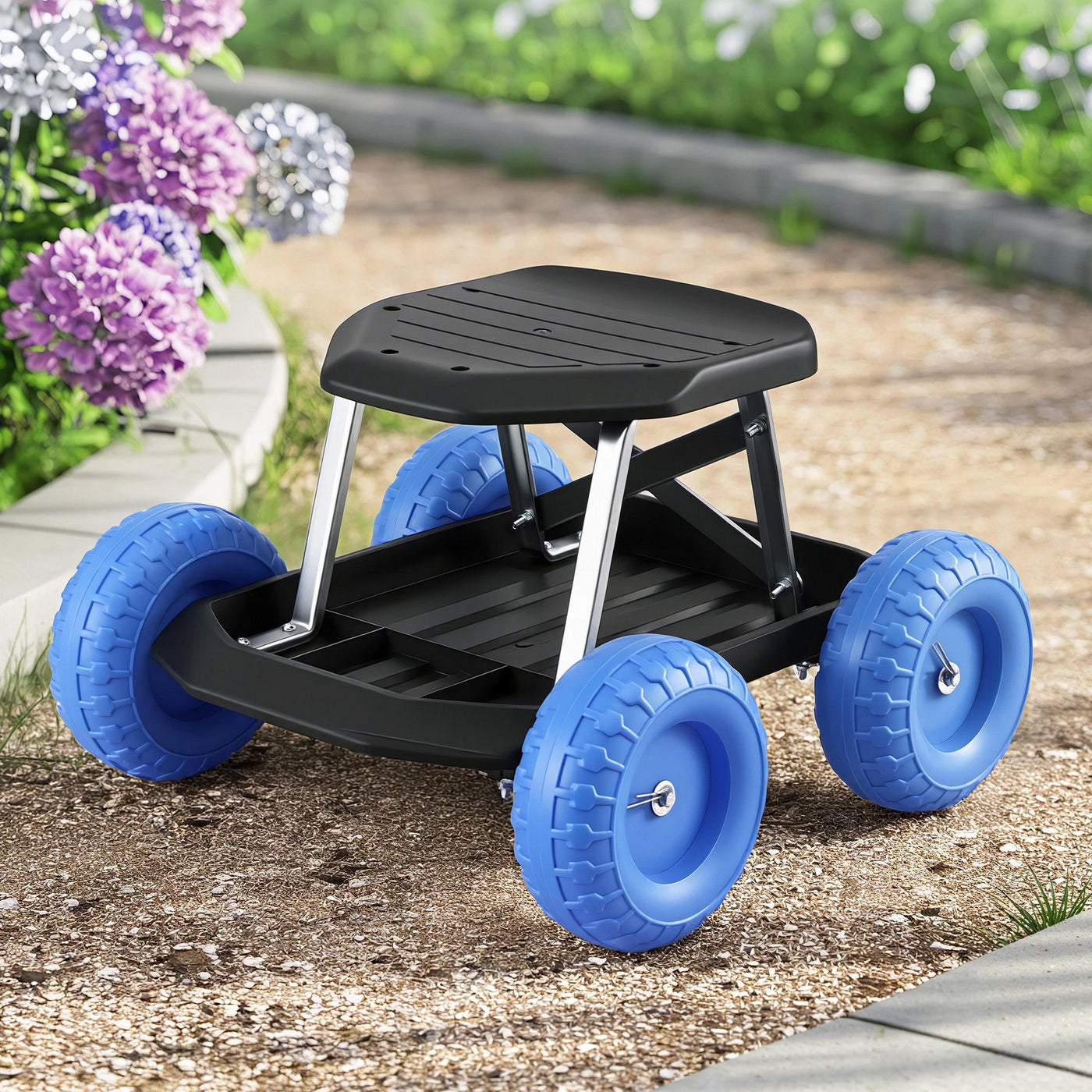 Gardeon Garden Cart Seat with Wheels, Rolling Work Stool with Tool Storage Tray, 440lbs (200kg) Heavy Duty Capacity Garden Stool for Outdoor Yard Work, Car Detailing, and Garage Maintenance, Blue/Black