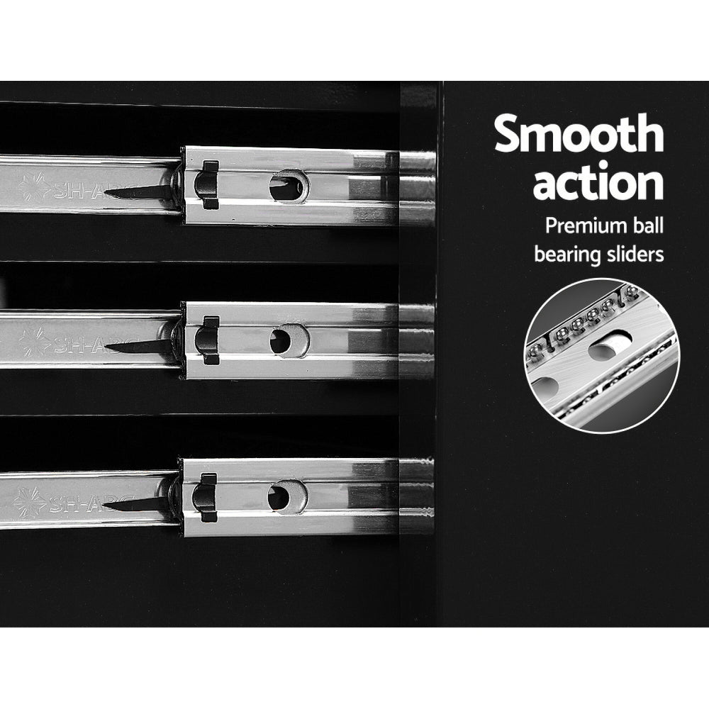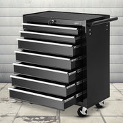 This robust, multi-drawer Giantz Tool Trolley is an essential for any workshop. Crafted from durable steel, it features smooth ball-bearing slides for easy access and a secure lock system for safety. Its spacious design includes varying drawer sizes to accommodate tools of all shapes, complete with non-slip liners. The chest is also mounted on omni-directional castors with locakble front wheels, ensuring a smooth maneuverability and stable positioning. Sleek and functional, it's perfect for organizing and protecting your valuable tools.