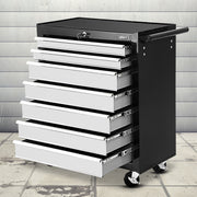 This robust, multi-drawer Giantz Tool Trolley is an essential for any workshop. Crafted from durable steel, it features smooth ball-bearing slides for easy access and a secure lock system for safety. Its spacious design includes varying drawer sizes to accommodate tools of all shapes, complete with non-slip liners. The chest is also mounted on omni-directional castors with locakble front wheels, ensuring a smooth maneuverability and stable positioning. Sleek and functional, it's perfect for organizing and protecting your valuable tools.