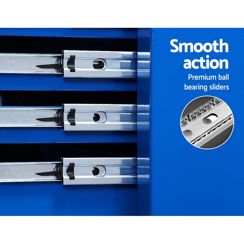 Made from powder-coated high tensile steel, the Giantz Tool Chest and Trolley is built to keep your precious tools in their proper place with drawers that are specifically designed to cater to various tool sizes. It actually comprises two sections, a top 9-drawer tool chest with smaller drawers and a lower 7-drawer trolley with larger drawers. The 2-in-1 design allows the ensemble to be used individually or as a combined unit. From top to bottom, each drawer slides in and out effortlessly on quality ball bearings incorporated into the metal drawer runners. Every drawer is also lined to protect your tools and keep them from moving about. Plus, the tool drawers are installed with upgraded cam barrel locks that are more reliable and secured compared to general locks as well as hassle-free use. With the trolley, the top layer is also lined with an EVA pad for working convenience with frequently-used tools. The trolley is installed with omni-directional castor wheels (two with brakes) for easy 360° mobility and fast standing. Not least, it also features a sturdy handle that provides full grip and smooth handling.