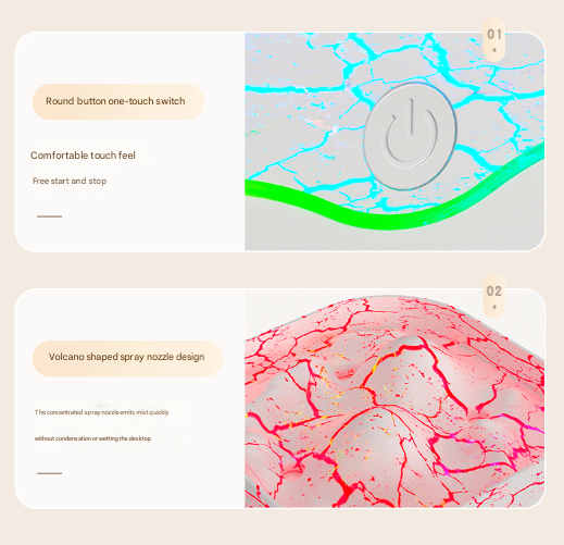 Simulated Flame/Volcano Effect: Specialized lighting illuminates the mist, creating an impressive visual similar to a gentle volcanic eruption, especially with warm light settings.