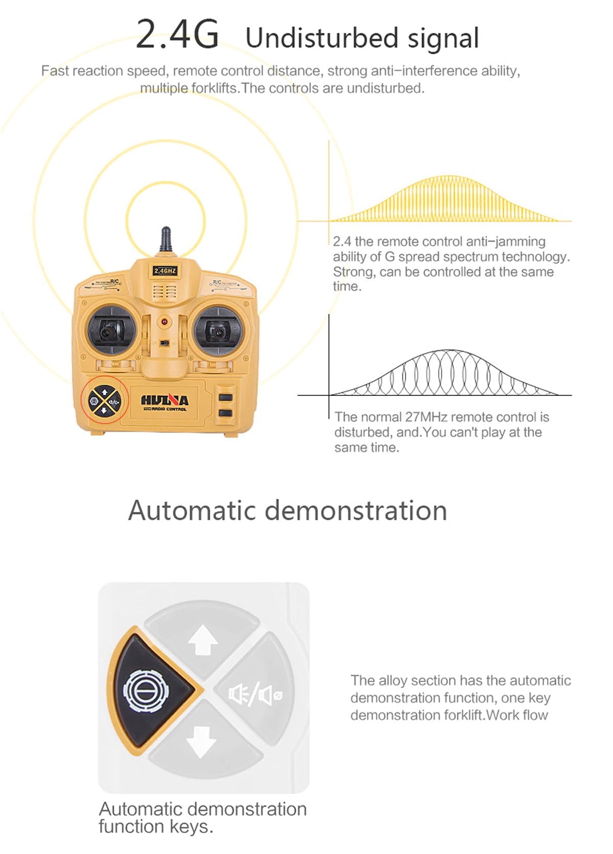 - Functions: 360 degree rotation,Forward/backward,Raise/lower forks, light ,With music