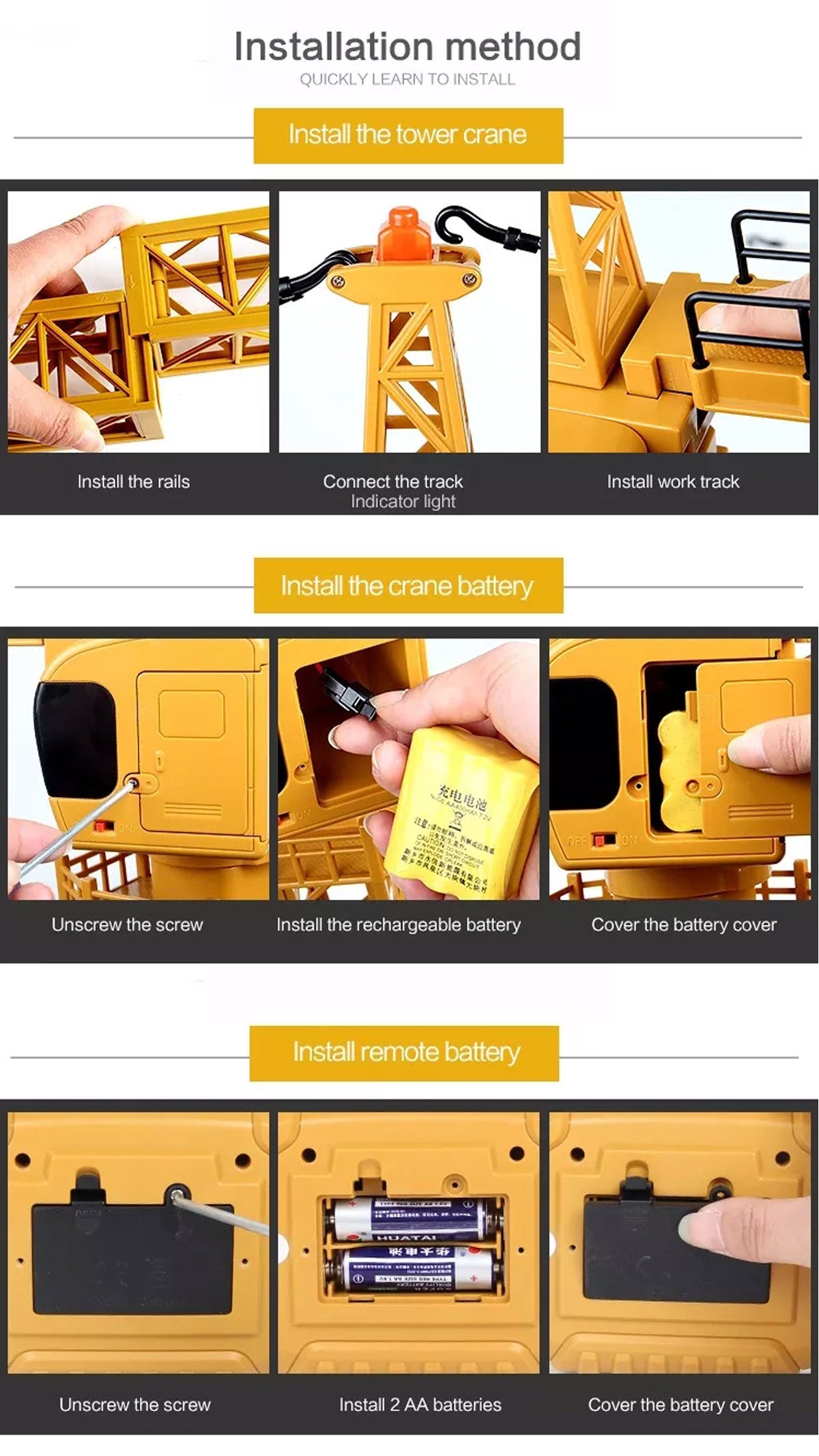 Remote control: Easily use the remote control, and the child can move the crawler crane to the right or left and raise or lower it. In addition, the construction crane compartment can be rotated on each side - to the right or left.