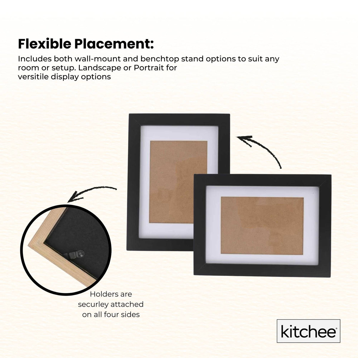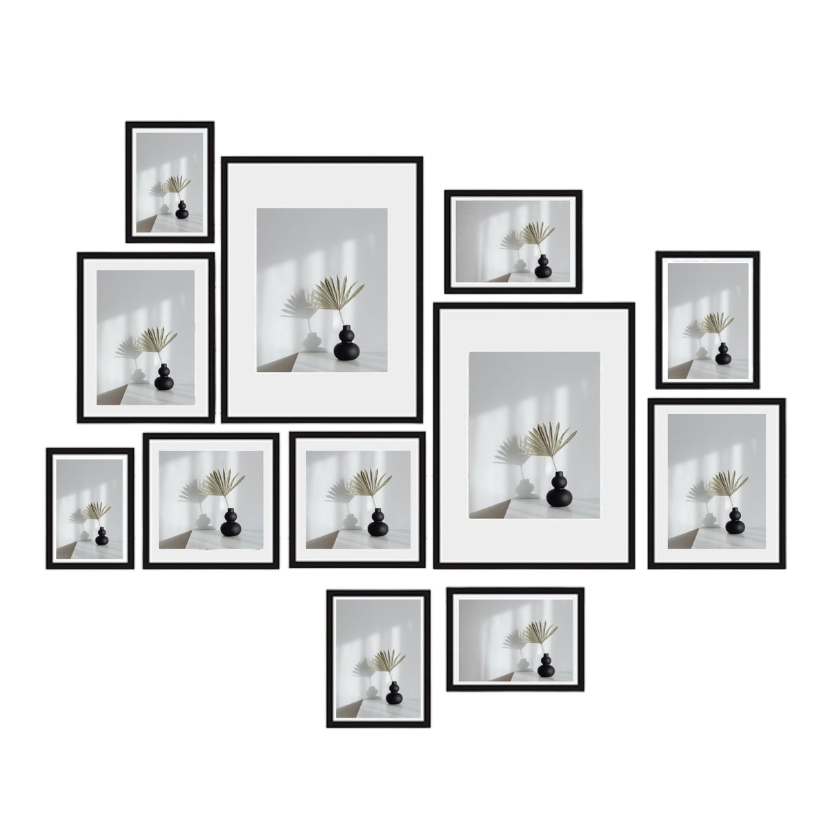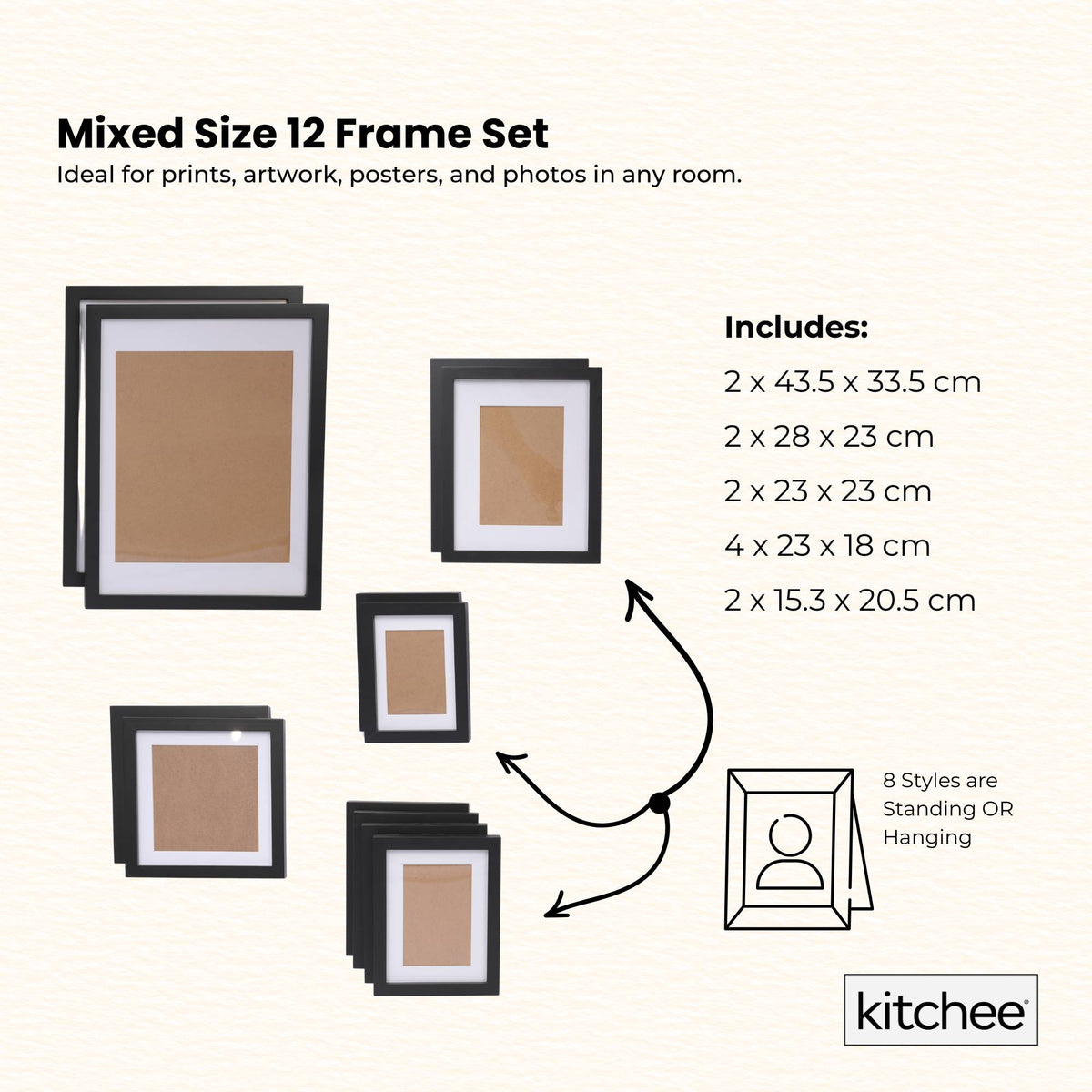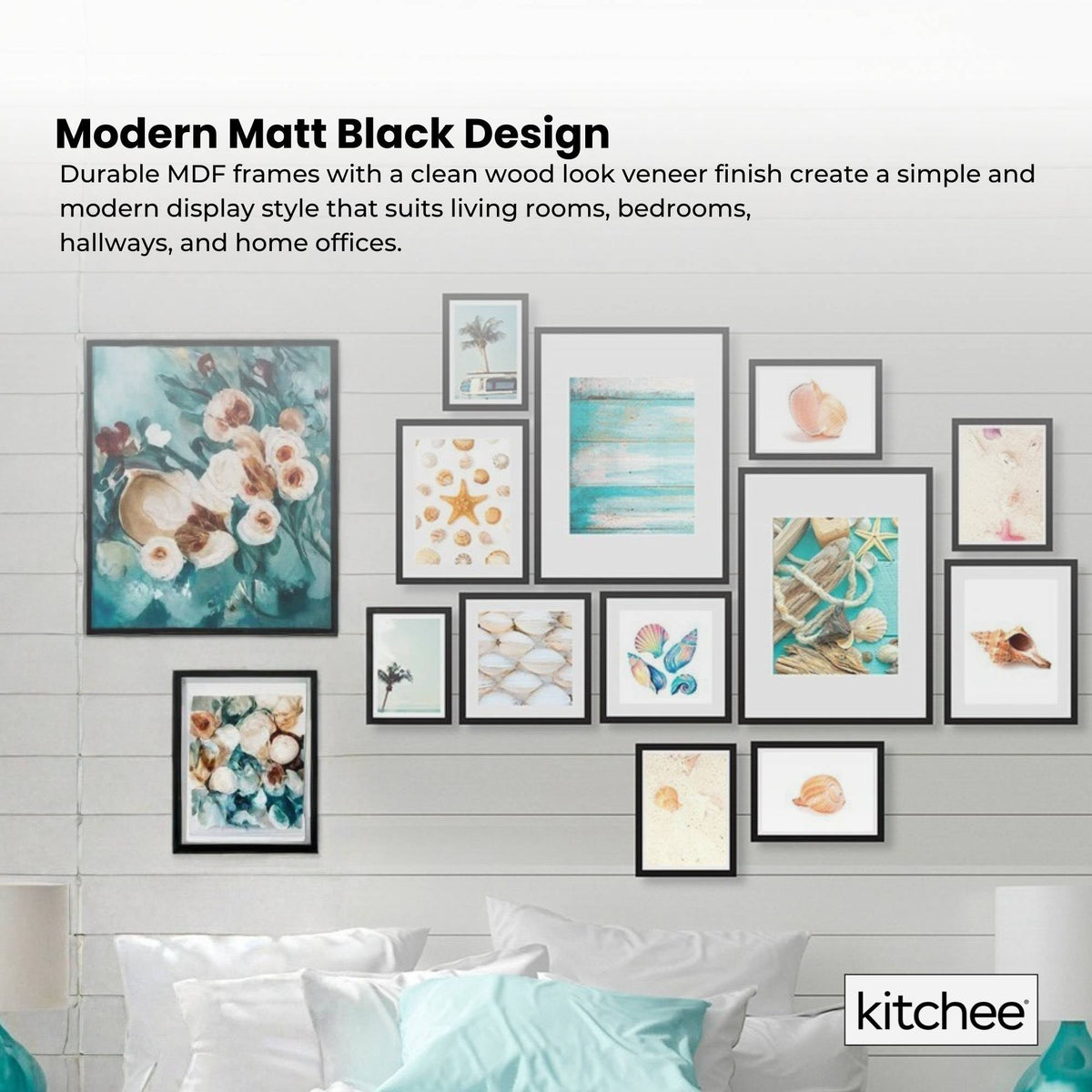 Kitchee 12 Pieces Photo Frame Set Matt Black offers a simple way to create your own gallery wall at home or in the office. The mixed size frames are ideal for displaying prints, artwork, posters, and photos. Each frame features a wood look veneer and durable MDF build for a clean modern style.