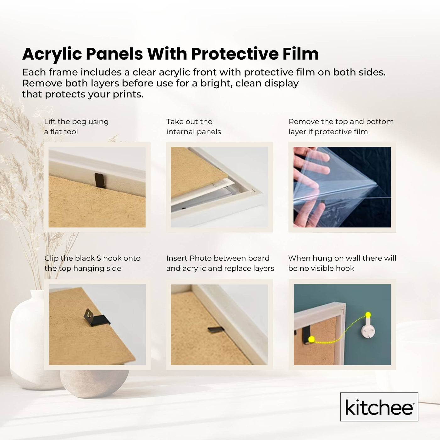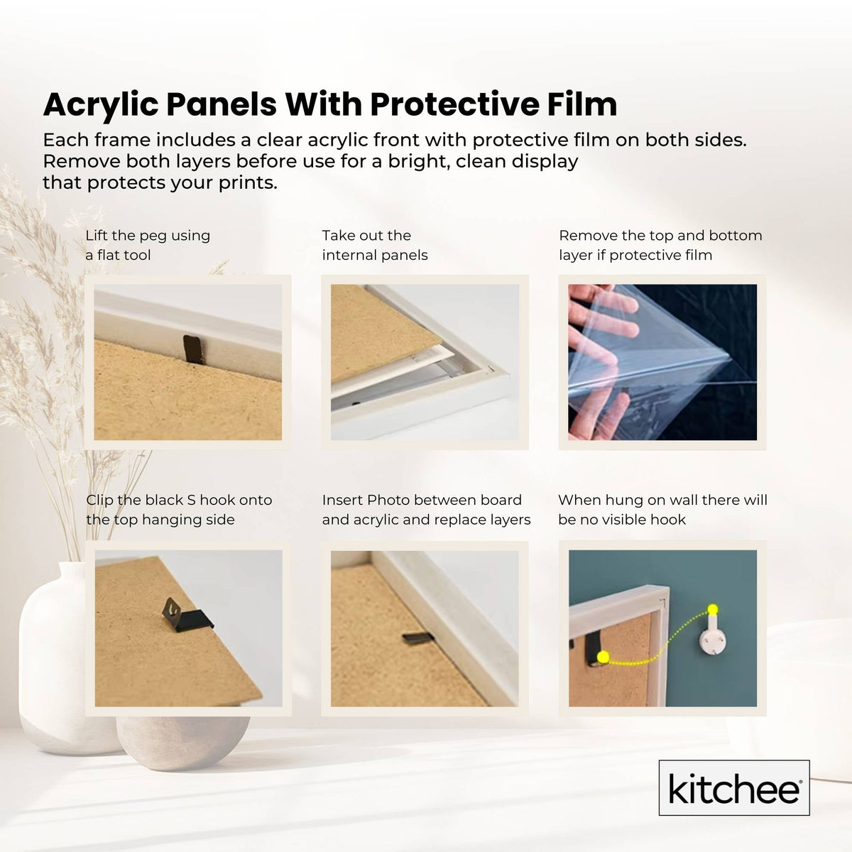 Indoor use only. Remove protective film from both sides of the acrylic panel before use. Please use hooks suited to your wall type. Some assembly required.