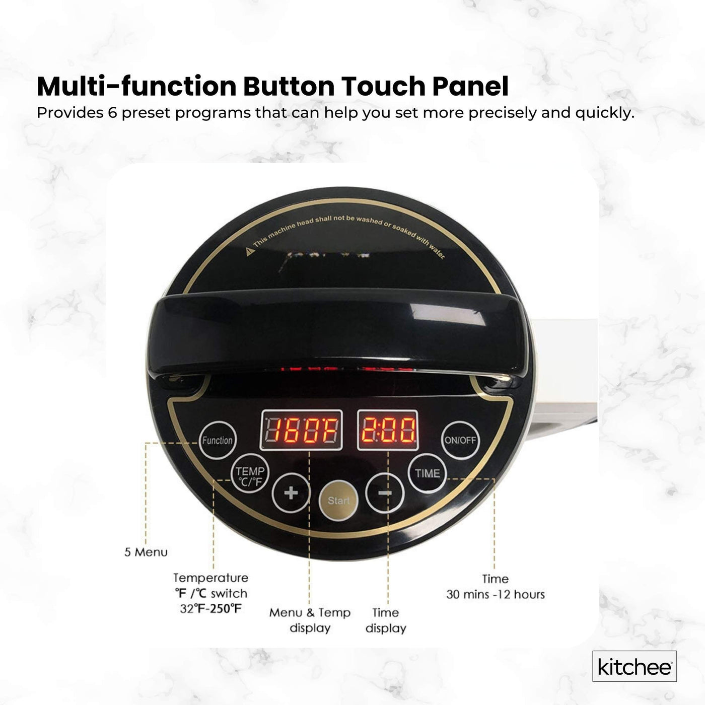 The Kitchee Electric Butter Oil Herbal Infuser Extractor + Decarboxylator Machine simplifies creating herbal-infused butters, oils, and tinctures. Ideal for home herbalists, it features precise temperature control and preset functions for customised results. Just add ingredients, select a function, and press start. The built-in decarboxylation boosts herb potency, while the automated cleaning cycle ensures easy maintenance. Create high-quality infusions effortlessly at home with our recipes included in the manual!