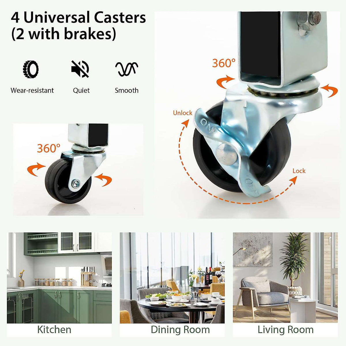 - This kitchen serving trolley is designed for effortless mobility and safe parking. With four iron universal casters, you can easily move the cart around to wherever you need it. Plus, two of the casters are lockable, allowing you to keep the trolley secure and stable with just a simple step on the brakes.