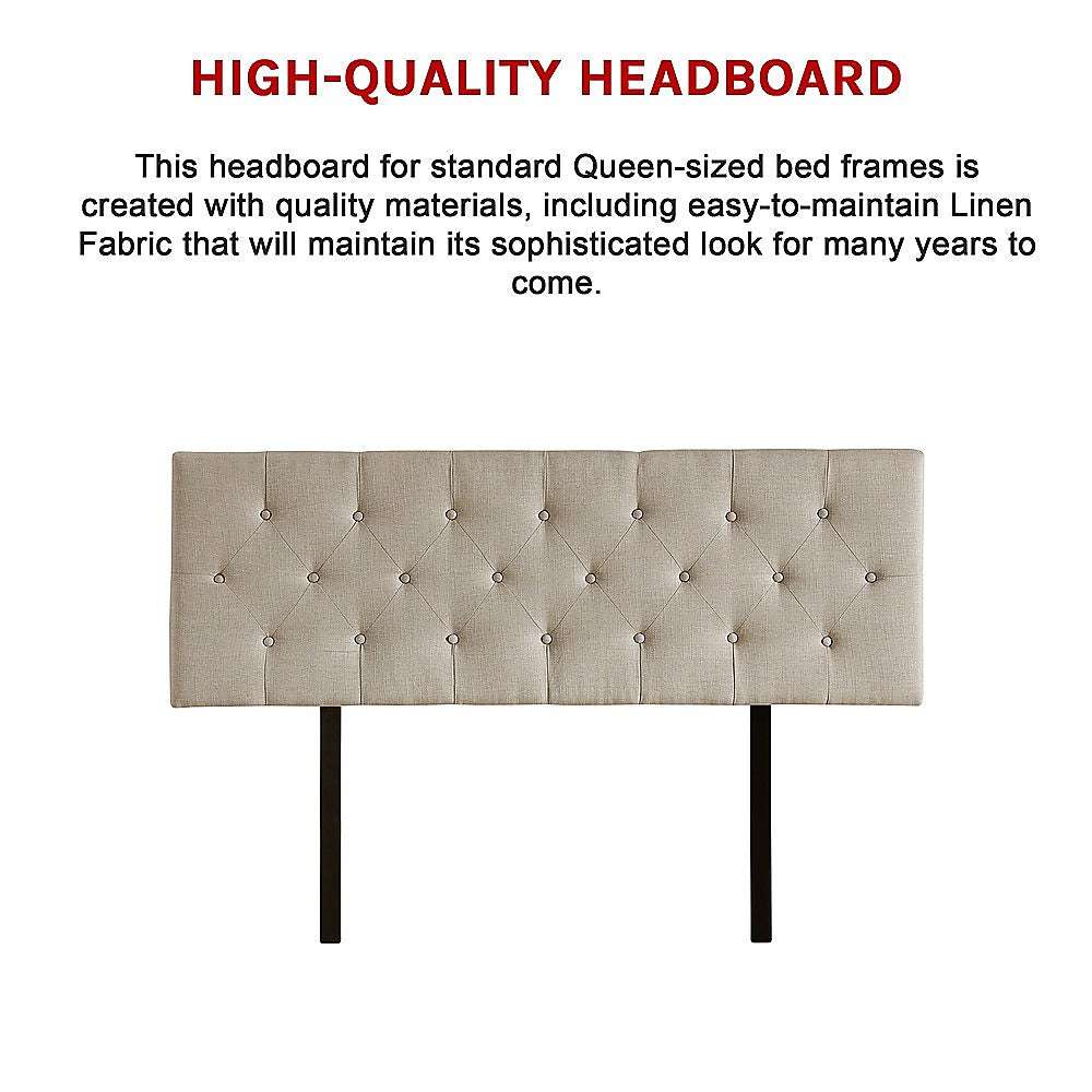 This headboard for standard Queen-sized bed frames is created with quality materials, including easy-to-maintain Linen Fabric that will maintain its sophisticated look for many years to come. This particular model comes with elegant stitching accents that provide just the right level of understated pop. A neutral beige will blend seamlessly with a wide variety of bed frames and other bedroom furniture.