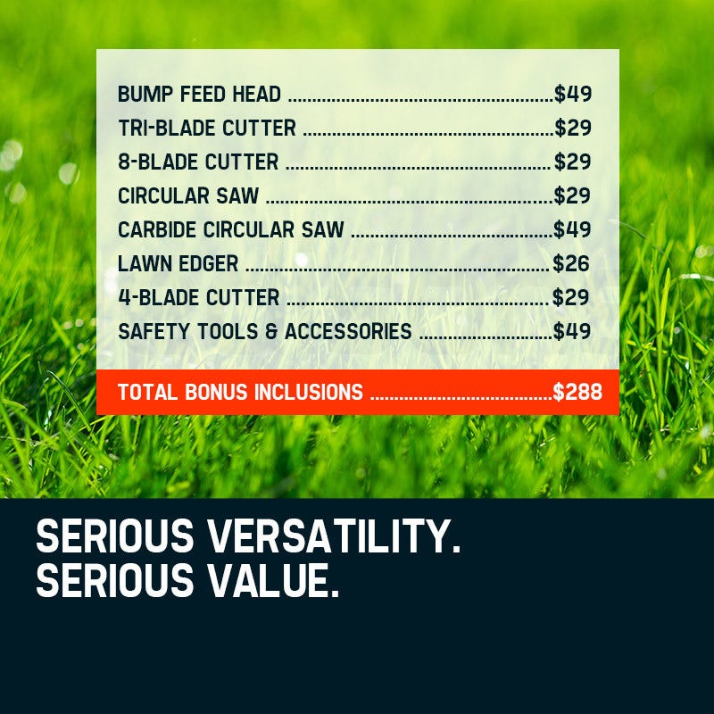 Whether you're trimming those tricky garden edges or overcoming that thick scrub, the MBX700 7-in-1 Multi-tool with its easy swap 5 specific task blades - including an exclusive Tungsten Carbide Alloy Saw Tooth Blade simply shreds the competition. And if you BUY NOW, you get the value packed BONUS EXCLUSIVE ANKLE GAITER SET + ACCESSORY KIT, featuring protective goggles, gloves, earmuffs, mini toolkit and fuel mixer. You won't find better value!