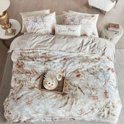Everlasting Natural Cotton Quilt Cover Set by Riviera Maison is a quintessential romantic duvet cover with a stylish, chic, and modern design. The leaves and flowers, combined with line drawings, alternate in different shapes and patterns. 'Riviera Maison' is subtly incorporated in the lines of the leaves. The design is set against a beautifully textured background. The natural colours of white, brown, red, and orange exclude tranquillity. The back of the duvet cover is beige.