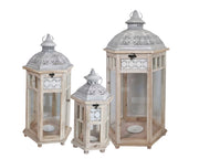 Set 3 Wooden Lantern w White Metal Top 76cm