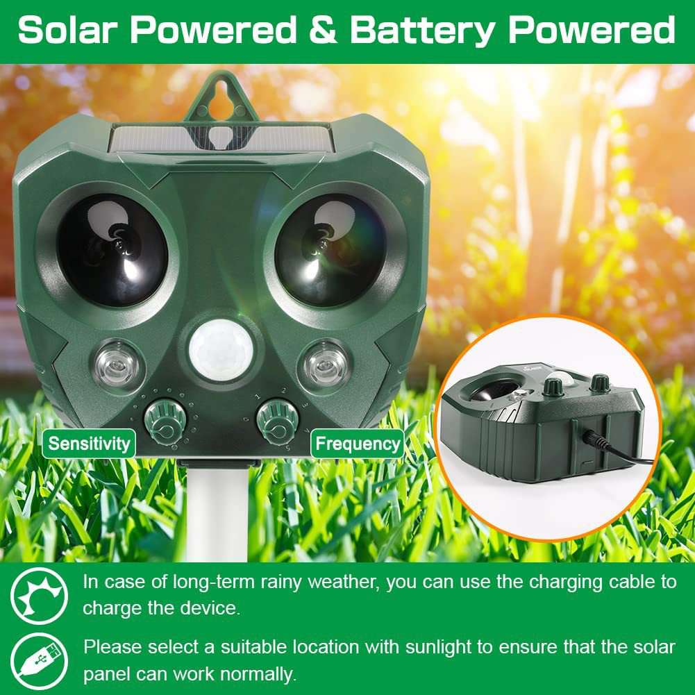 The ultrasonic sound, paired with LED lights, creates a deterrent for animals such as mice, raccoons, birds, and stray cats. The device automatically activates when it detects motion, ensuring it only works when necessary to conserve energy.