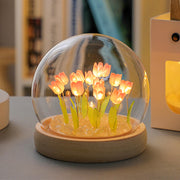 (Thirteen Pink Tulips) Glowing Tulip Dome Lamp - Wooden Base, Bedside Table Decoration