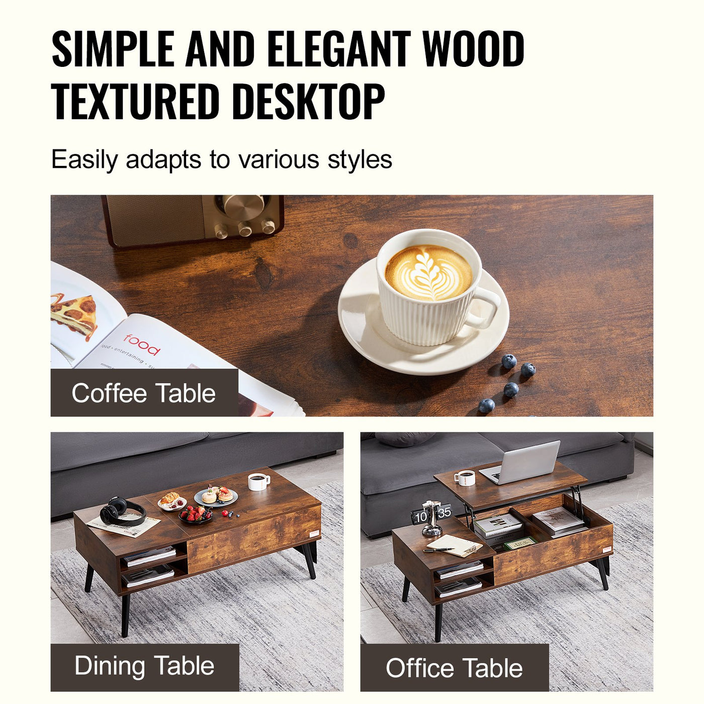 VEVOR Lift Top Coffee Table 39.4 in Rectangle Coffee Table for Living Room Brown