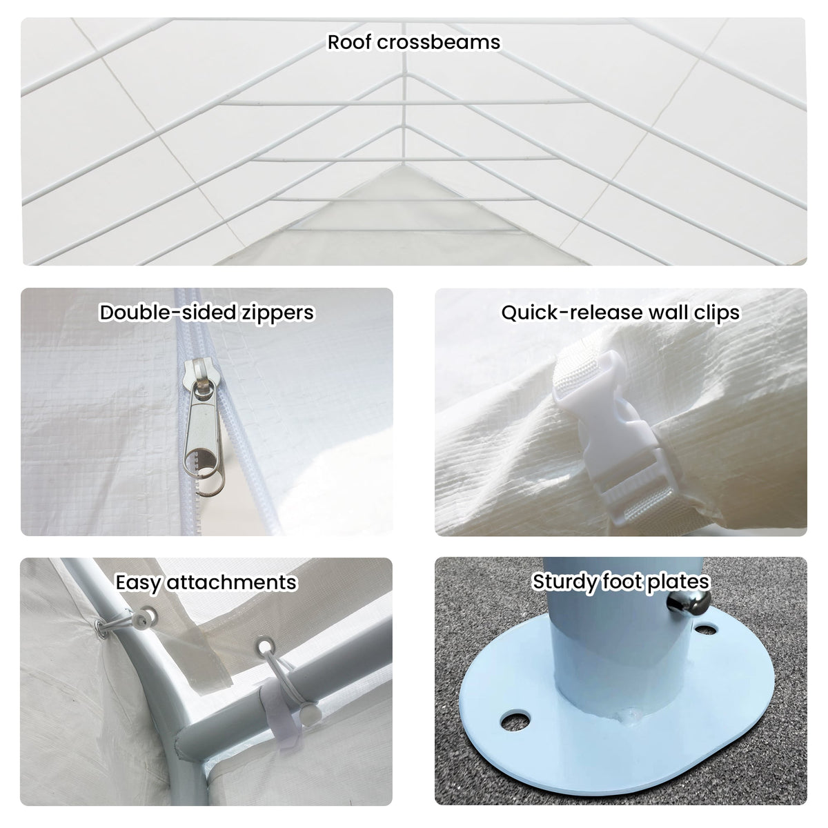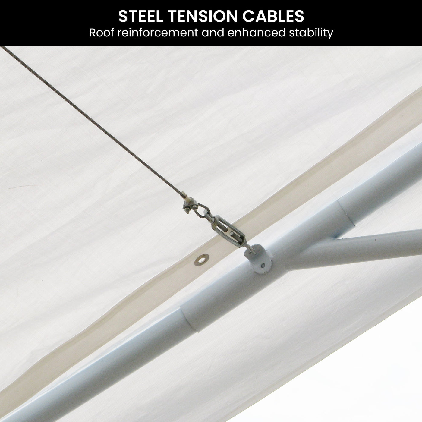 This multi-configuration pavilion suits all occasions. Each side can be quickly fitted or just leave some off for an open design. The end wall has a zip-up door with a 1.8m clearance which you can tie open or leave closed.